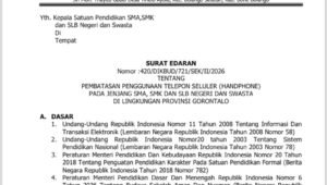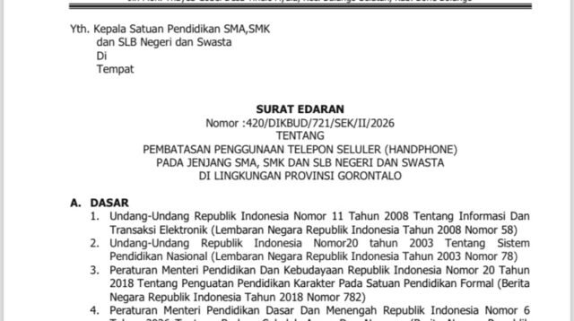 Dinas Pendidikan dan Kebudayaan Provinsi Gorontalo resmi menerbitkan Surat Edaran Nomor 420/DIKBUD/721/SEK/II/2026 tentang pembatasan penggunaan […]