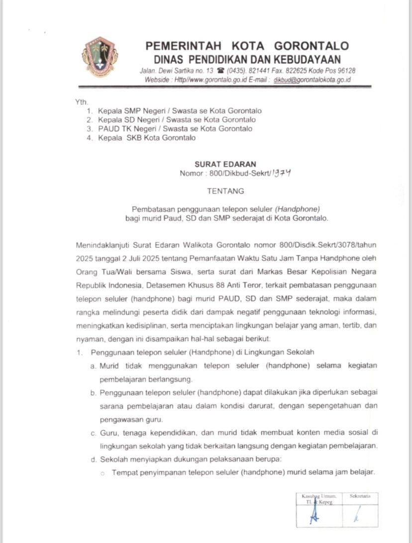 Pemerintah Kota Gorontalo melalui Dinas Pendidikan dan Kebudayaan resmi menerbitkan Surat Edaran tentang pembatasan penggunaan telepon seluler (handphone) bagi murid PAUD, SD, dan SMP sederajat di wilayah Kota Gorontalo.