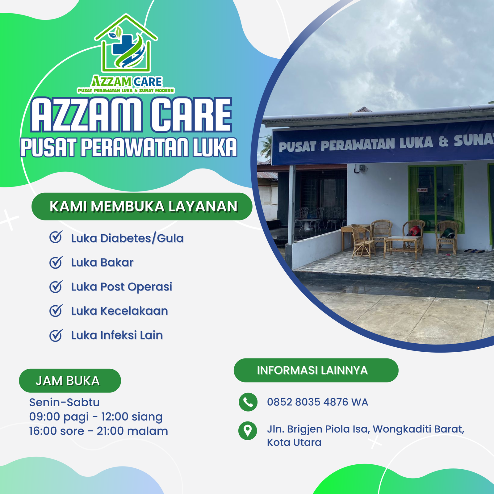 Komitmen menghadirkan layanan kesehatan berkualitas kembali ditunjukkan dengan hadirnya AZZAM CARE, Pusat Perawatan Luka & Sunat Modern, yang kini resmi melayani masyarakat di Kota Gorontalo. Berlokasi di Jalan Brigjen Piola Isa, Wongkaditi Barat, AZZAM CARE menjadi alternatif layanan kesehatan khusus perawatan luka dengan pendekatan modern dan terstandar.