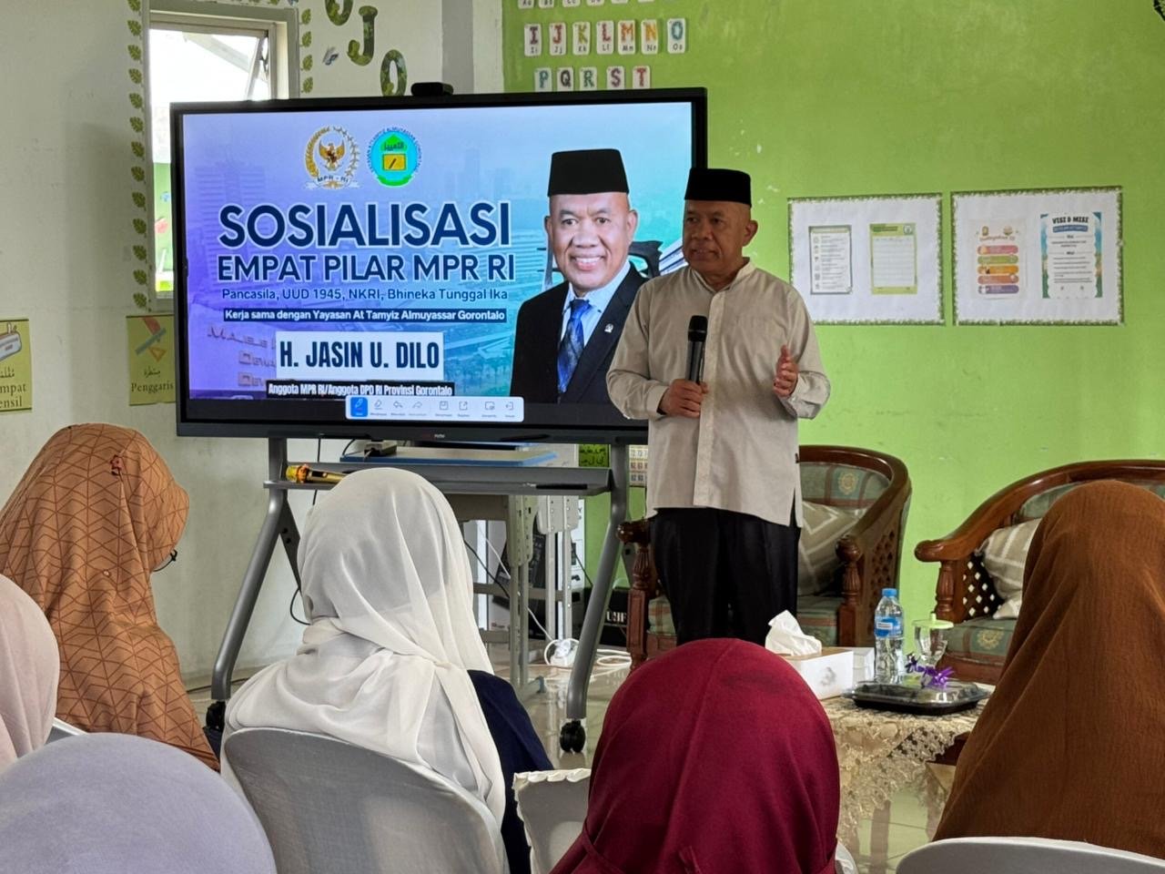 FOKUSMETRO.COM — Anggota MPR RI perwakilan Provinsi Gorontalo, H. Jasin U. Dilo, terus memperkuat benteng ideologi bangsa di tingkat akar rumput. Menggandeng Yayasan At Tamyiz Al Muyassar Gorontalo, Jasin menggelar Sosialisasi Empat Pilar MPR RI di Gedung Pertemuan At Tamyiz, Kelurahan Molosipat U, Kecamatan Sipatana, Kota Gorontalo, Ahad (14/12/2025).